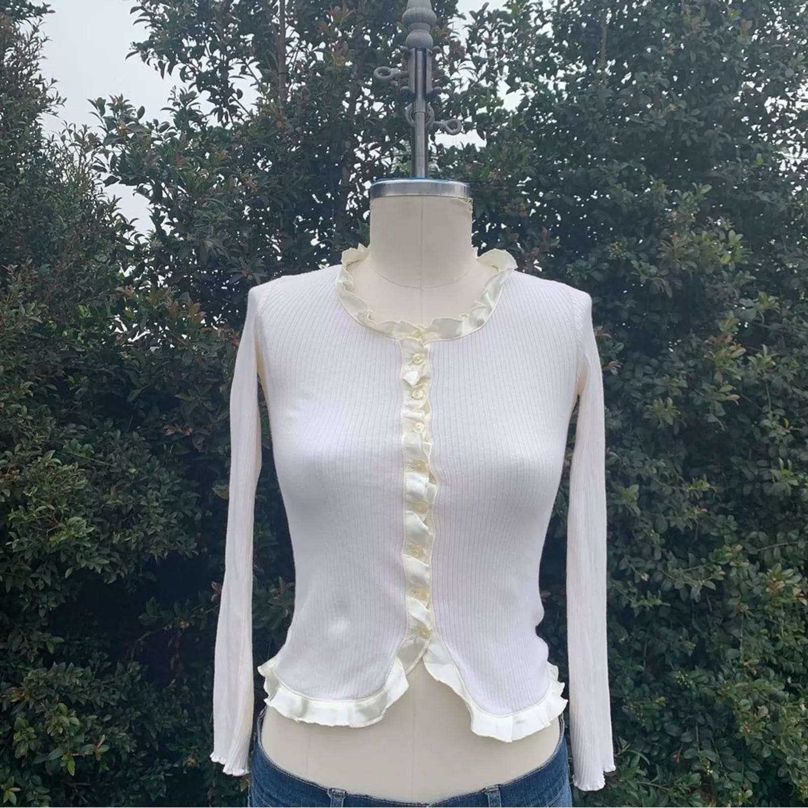 This Anne Fontaine-esque y2k DKNY longsleeve with satin ruffled hem is so cute for everyday. Size XS/S, a steal at $20