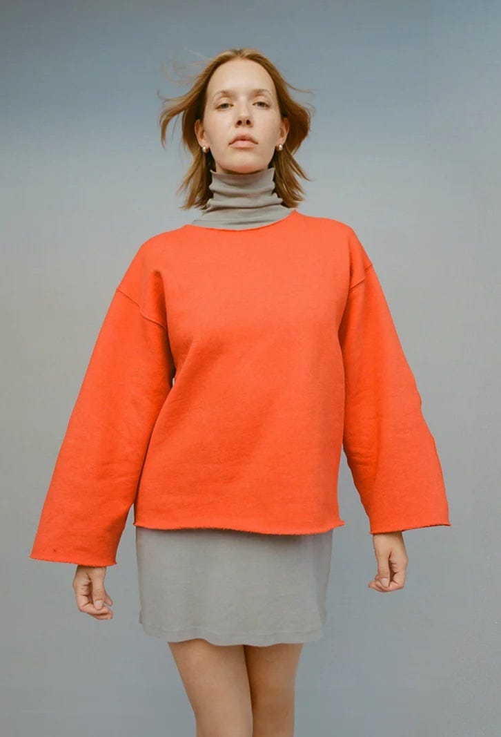 I love this boxy raw hem sweatshirt from Gil, comes in other colors as well but the fiery orange caught my eye. $185